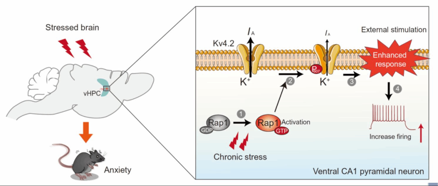本研究發(fā)現(xiàn)慢性壓力應(yīng)激選擇性上調(diào)海馬區(qū)Rap1活性(Rap1-GTP水平升高),而不影響其總蛋白表達(dá)。進(jìn)一步篩選發(fā)現(xiàn)腹側(cè)海馬錐體神經(jīng)元中Rap1活性上調(diào)對于慢性應(yīng)激致焦慮至關(guān)重要。機制上,Rap1激活通過促進(jìn)電壓門控鉀通道Kv4.2 Thr607位點磷酸化,降低A型鉀電流,導(dǎo)致錐體神經(jīng)元過度興奮。通過特異性抑制腹側(cè)海馬錐體神經(jīng)元Rap1活動或阻斷Kv4.2 Thr607位點磷酸化,均能有效逆轉(zhuǎn)慢性應(yīng)激引起的錐體神經(jīng)元過度興奮及其促焦慮效應(yīng),提示靶向Rap1/Kv4.2信號可能作為焦慮障礙治療的潛在干預(yù)靶點。