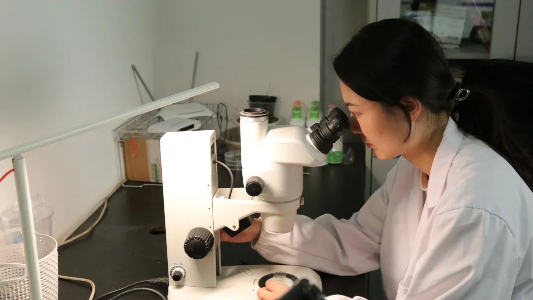 王宏燕在用顯微鏡觀察螨蟲