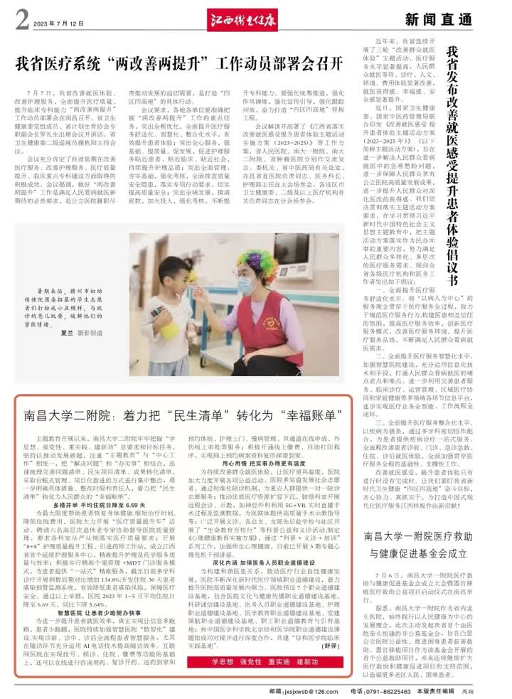 編者按:7月12日,《江西衛(wèi)生健康》以“南昌大學二附院:著力把‘民生清單’轉化為‘幸福賬單’”為題刊發(fā)了南昌大學二附院牢牢把握“學思想、強黨性、重實踐、建新功”總要求和目標任務,著力把“民生清單”轉化為人民群眾的“幸福賬單”的報道,具體內容如下: