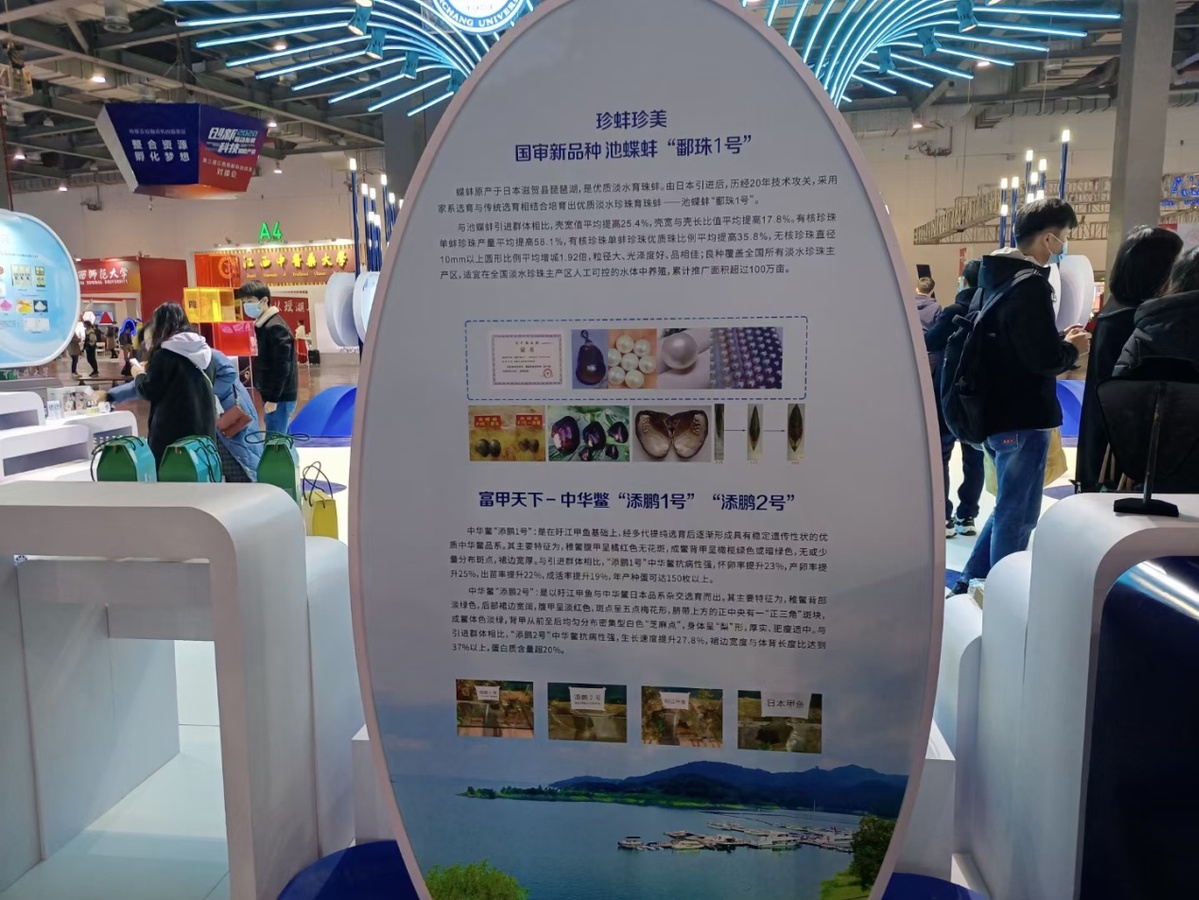珍蚌珍美團隊攜最新科技成果及實物參展,主要圍繞20年選育的特種水產新品種池蝶蚌“鄱珠1號”進行展示,向大眾介紹了與其配套的“一水兩治、一蚌兩用”生態服務功能新技術和新模式,還進一步闡述了相關延伸成果。