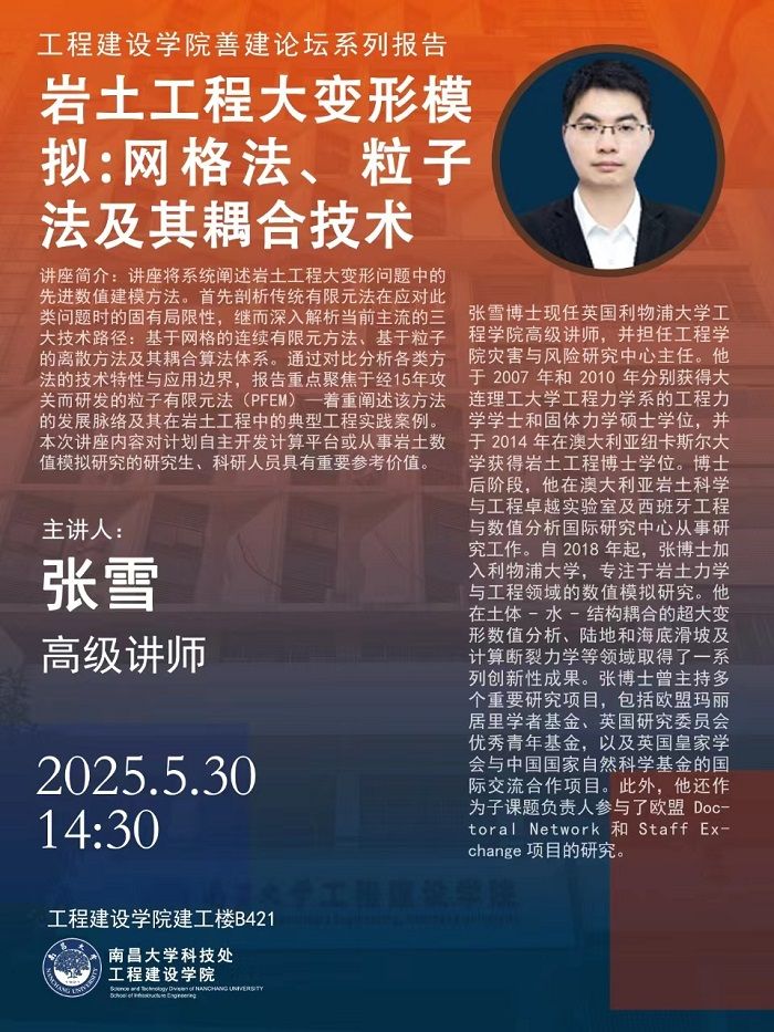 工程建設學院善建論壇系列報告:巖土工程大變形模擬:網格法、粒子法及其耦合技術